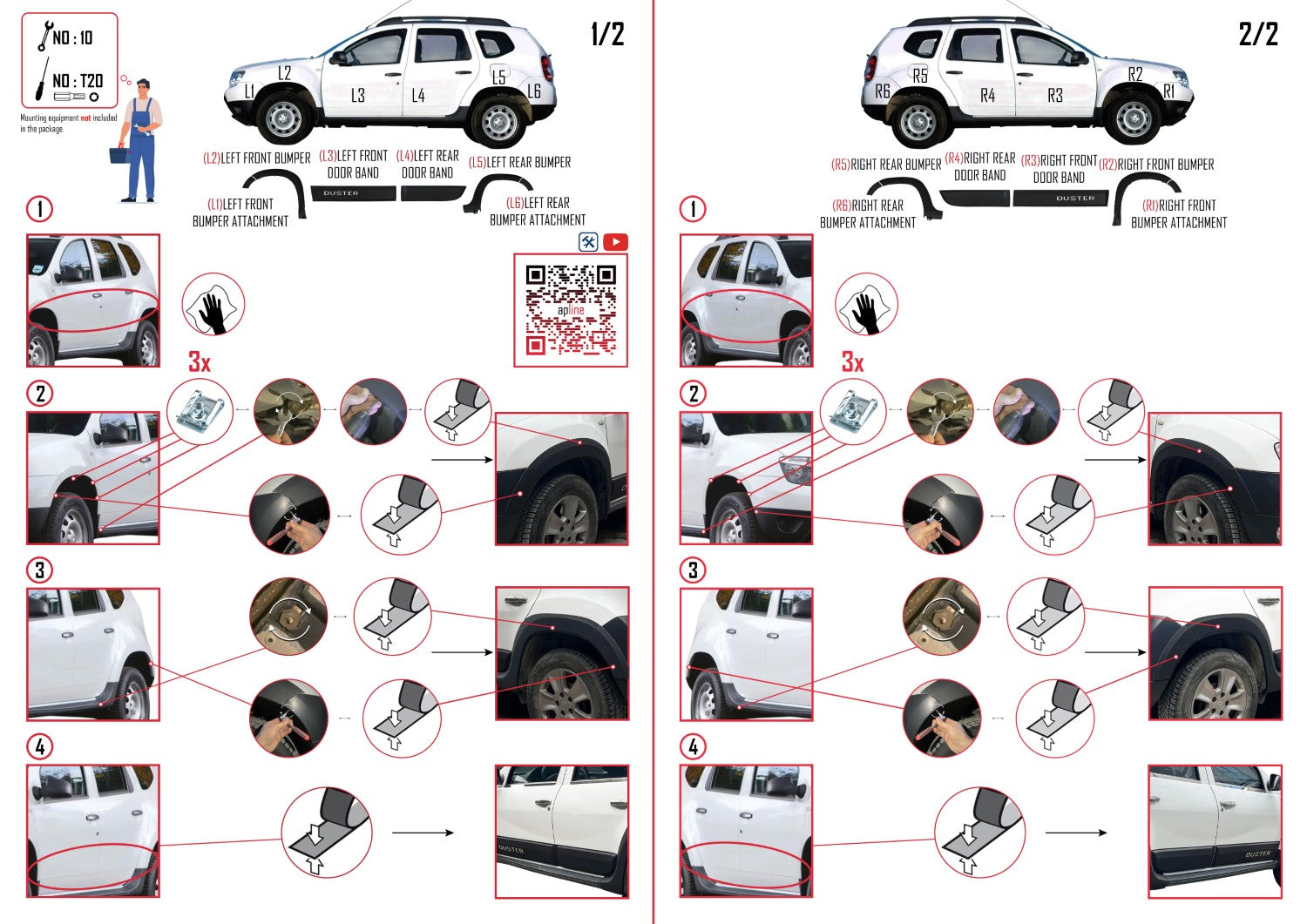The product can be easily assembled and disassembled to the vehicle. No drilling and cutting is done in the vehicle during application. For side door guards, assembly is made with double-sided acrylic tape on the part.The fenders are produced to coincide with the original screw holes on the vehicle. The screws here are removed, the product is reinstalled by assembling the product. You can access the assembly video by scanning the QR code in the instruction. After using the product, you can easily separate the product from the vehicle body. It does not damage the body and paint of the vehicle.