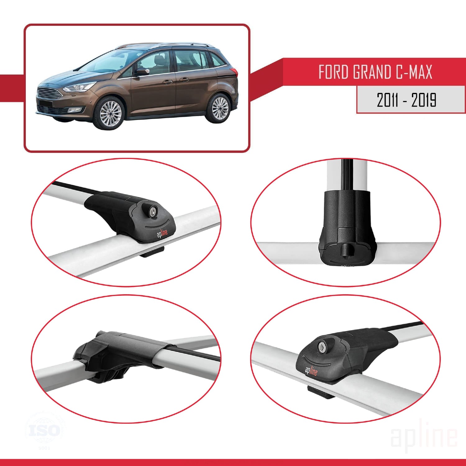 Compatible avec Ford Grand C-Max (C344) 2011-2019 ACE-1 Barres de Toit Railing Porte-Bagages de Voiture Gris Aluminium 2 Barres